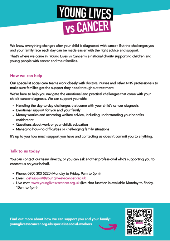 This one-page leaflet introduces Young Lives vs Cancer and our services to parents and carers of children who have recently been diagnosed. It includes details on how we can help and contact details to get in touch for support.