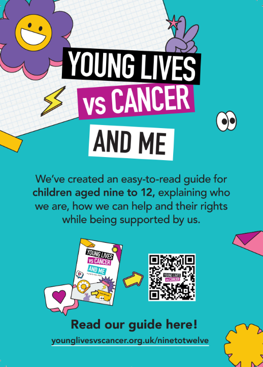 These flyers direct families to the online version of Young Lives vs Cancer and Me, a resource designed for nine to 12 year olds that explains how Young Lives vs Cancer helps children and their families. It also provides information on how we keep children and their information safe while they’re accessing our services, and how they can give feedback on the support they’ve received. The web page includes a printer-friendly PDF of the resource and two children’s activities that can be downloaded and printed out.